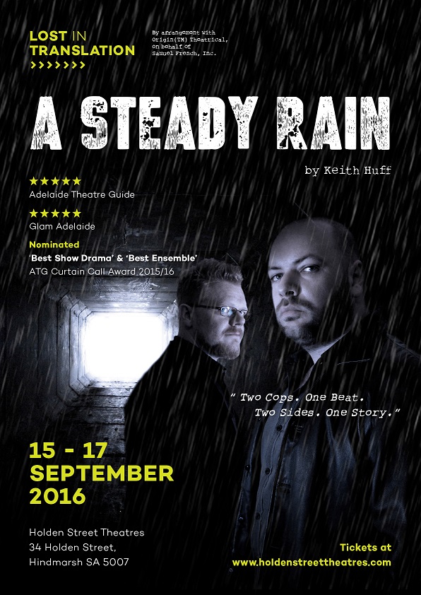 A Steady Rain chronicles love and rage on the streets of Chicago as a domestic disturbance call sends two Chicago cops, friends since childhood, on a harrowing journey that will test their loyalties and change their lives forever. During a routine day, a pair of seasoned policemen, Denny and Joey, return a panic-stricken boy to his guardian. The two protagonists relate their shared story from very different perspectives, giving a picture of family in all its forms, along with the questionable moral choices made in its name. As their lifelong friendship is put to the ultimate test, both men must deal with honour and loyalty in the face of adversity.